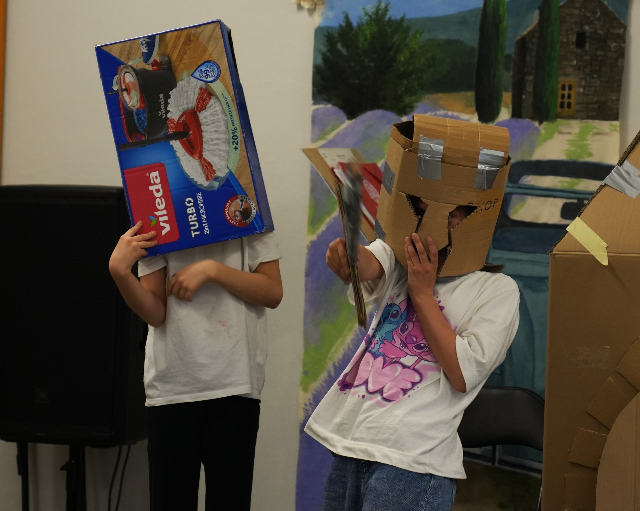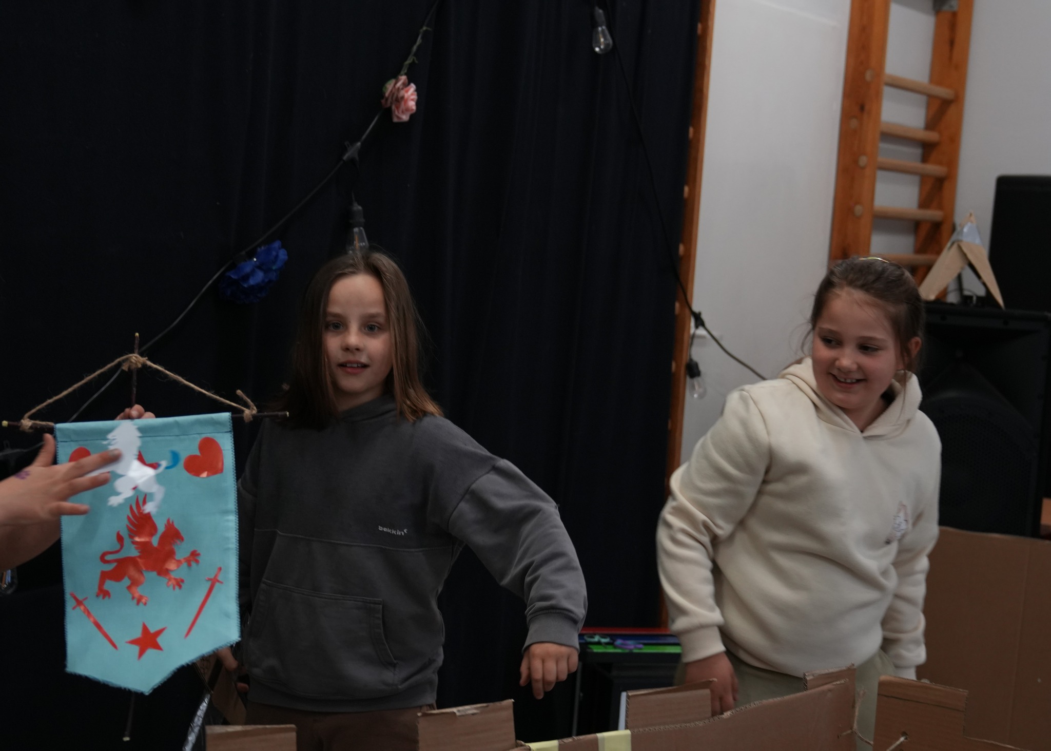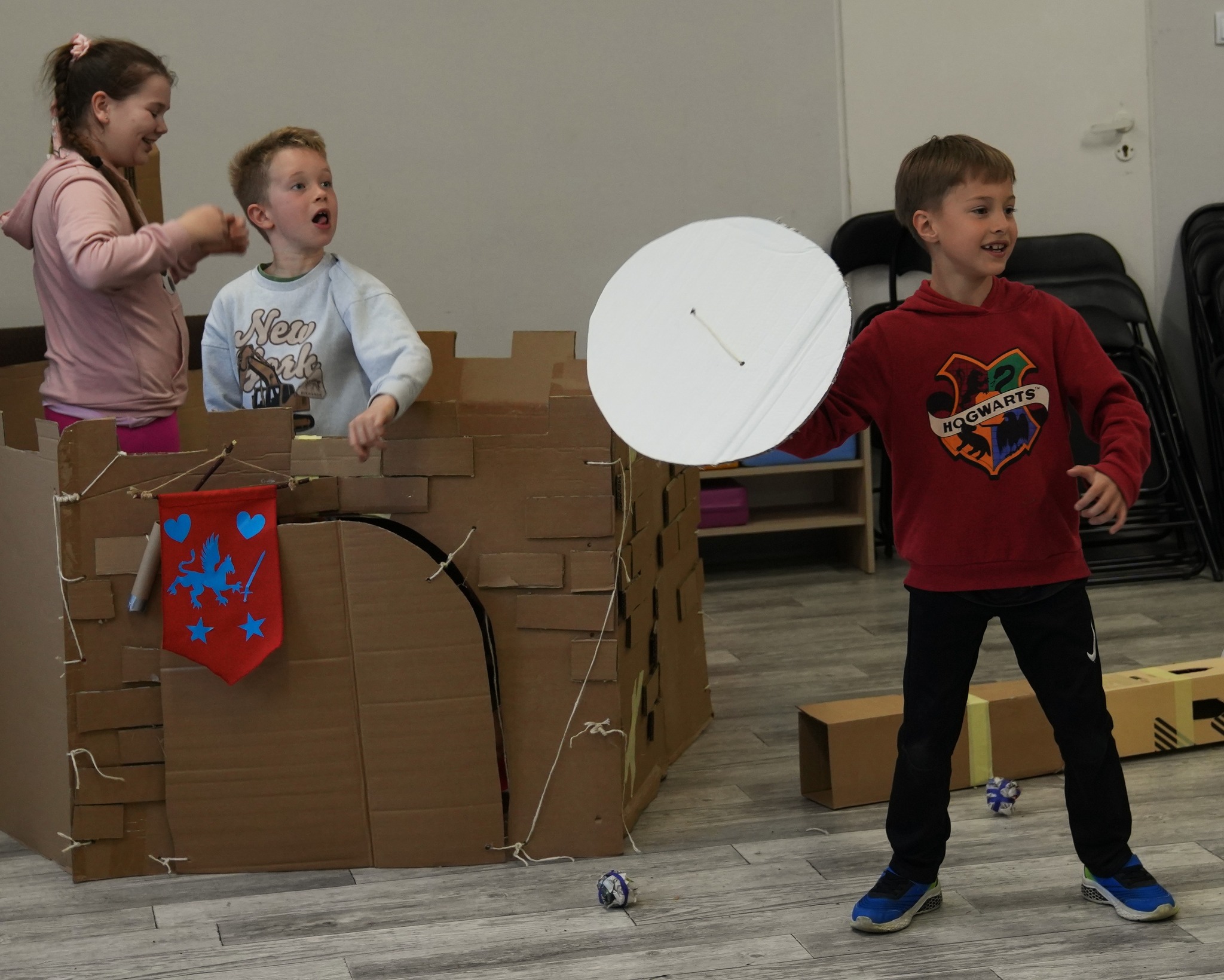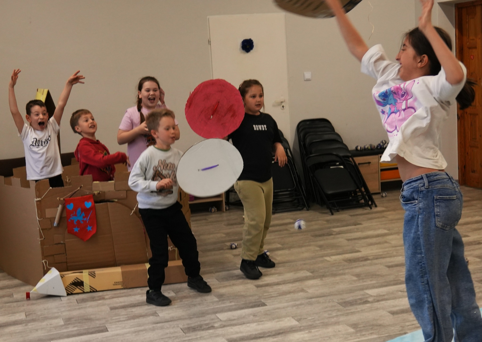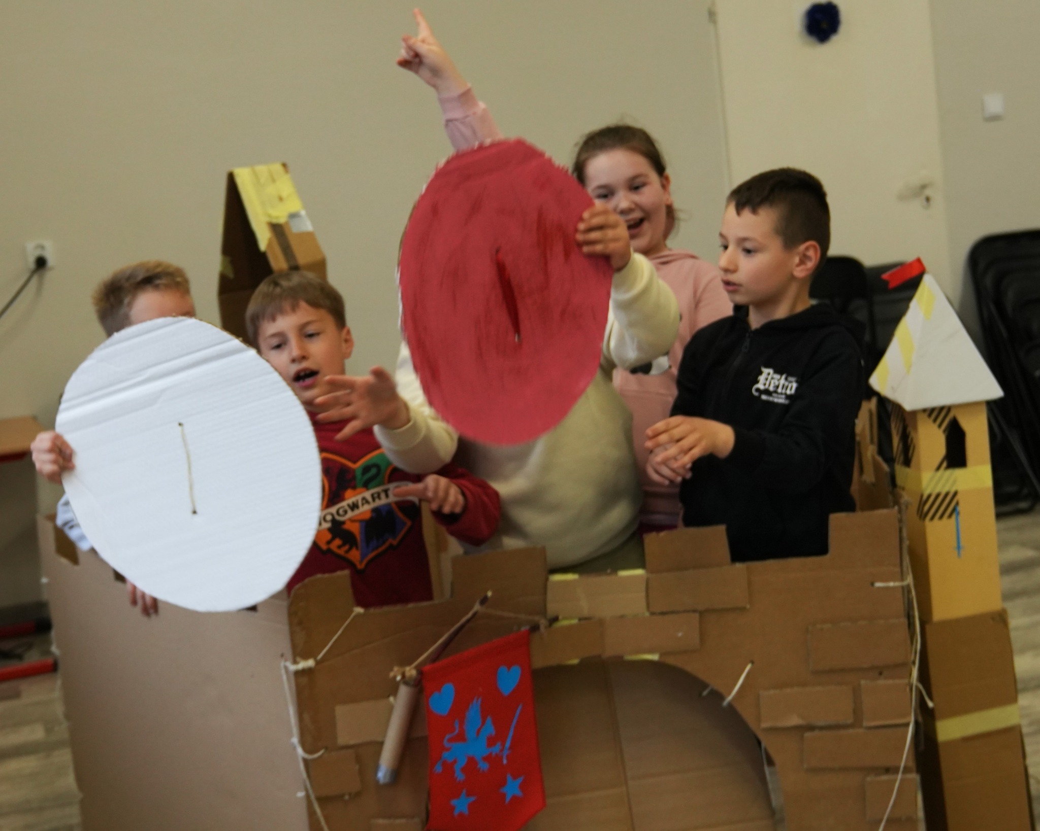 Na naszym Eko Dniu najpierw obejrzeliśmy krótki filmik i padło kilka słów o recyklingu, a potem ruszyliśmy do działania — budowaliśmy eko fortecę z kartonów, maskowaliśmy ją tak, żeby nieprzyjaciel jej nie wypatrzył, broniliśmy jej jak prawdziwi rycerze, a do tego projektowaliśmy proporce i rycerskie zbroje.