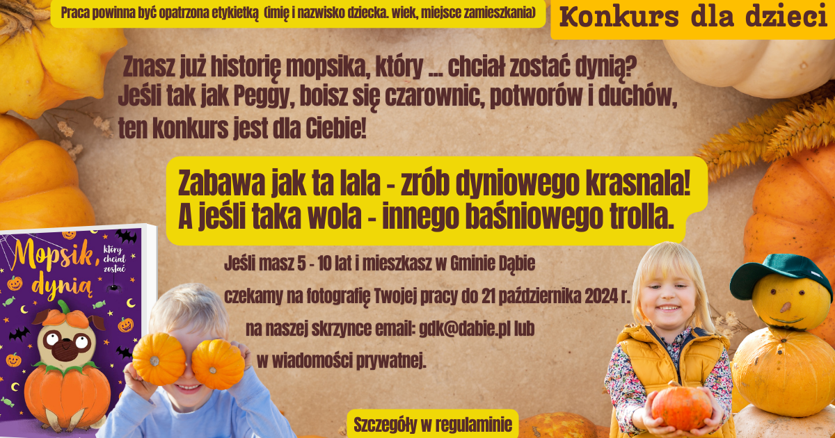 Zapraszamy wszystkie dzieci w wieku od 5 do 10 lat z Gminy DÄ…bie do udziaÅ‚u w pomaraÅ„czowym konkursie! Przed Wami proste zadanie : stwórzcie dyniowÄ… postać z baÅ›ni.