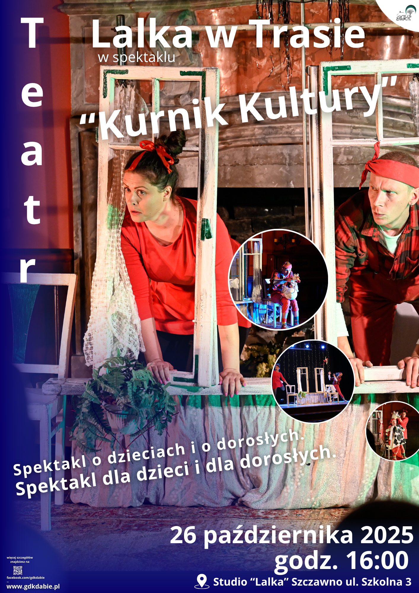 Puste kalendarze na niedzielne popołudnie? Świetnie się składa! 26 października 2025 o 16:00 Studio „Lalka” w Szczawnie (ul. Szkolna 3) gości Teatr „Lalka w Trasie” ze spektaklem „Kurnik Kultury” — dla całych rodzin, nie tylko dla dzieci.