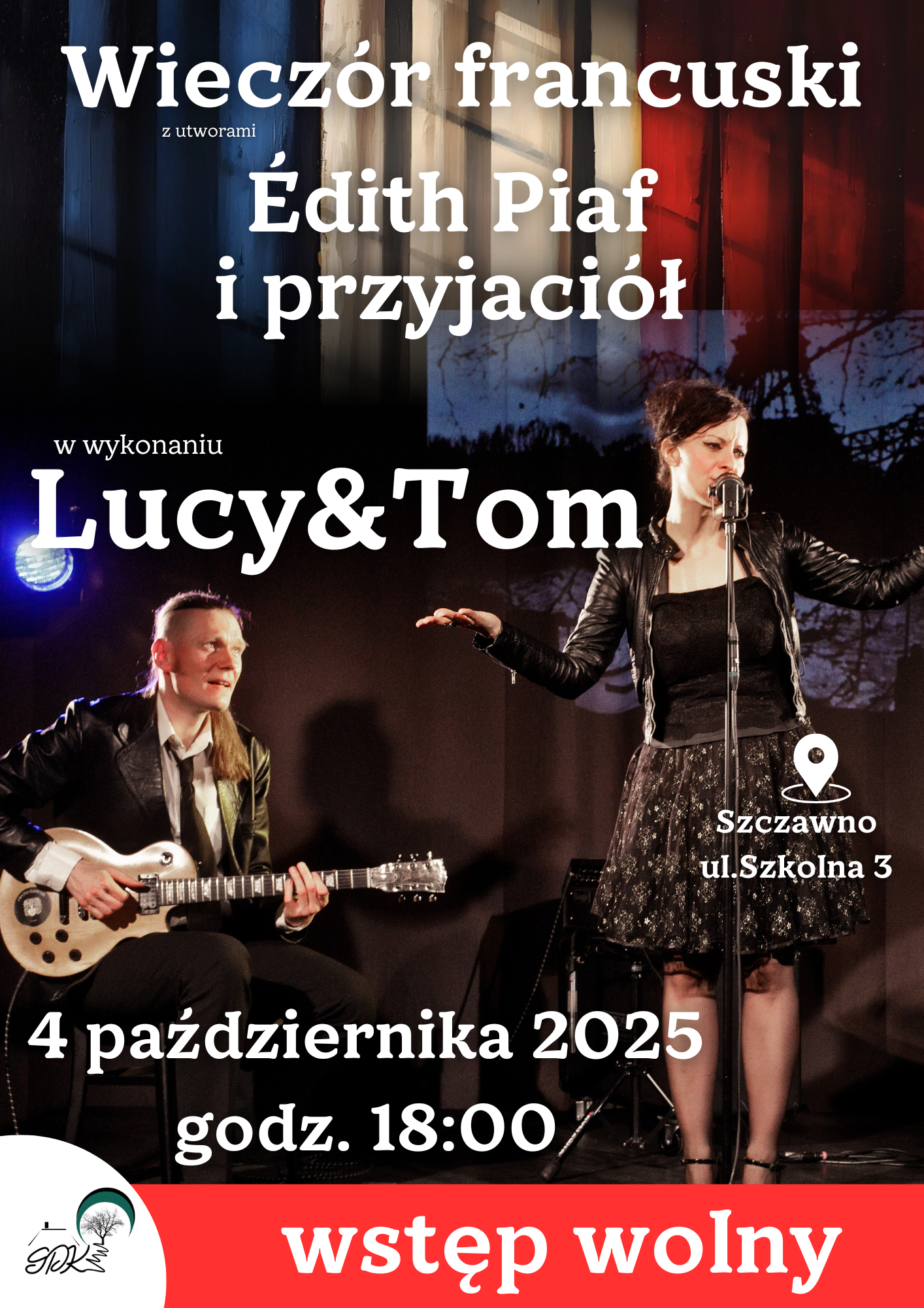 Zanurz się w paryskiej aurze wieczoru pełnego emocji, świateł i ponadczasowych melodii. Zapraszamy na wyjątkowy, kameralny Wieczór Francuski poświęcony utworom Édith Piaf i artystów jej kręgu. W interpretacji duetu Lucy & Tom usłyszysz pieśni, które pachną paryskimi zaułkami – pełne wzruszeń, nostalgii i szlachetnej prostoty. Spotkajmy się 4 października w Szczawnie, ul. Szkolna 3, o 18:00.